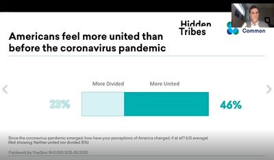 Stephen Hawkins, research director of More in Common, then gave a presentation on a new study, “Polarization and the Pandemic: How COVID-19 is Changing Us.” One of the findings of the recent polling is that the shared experience of the coronavirus pandemic has bolstered many Americans’ perceptions of unity.